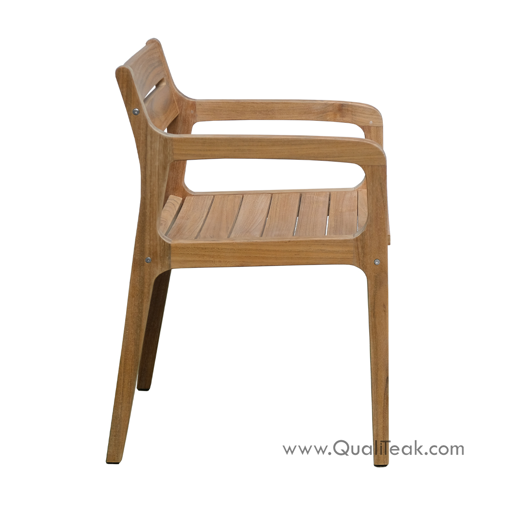 Bring a clean, architectural aesthetic to your commercial outdoor projects with the all-wood Fuego Dining Armchair. Manufactured in Indonesia by Qualiteak, this version of the Fuego line trades the woven backrest for a beautifully crafted, fully solid wood profile. Crafted from premium, fine-sanded solid teak, the frame is left intentionally unfinished to naturally weather into a highly sought-after silvery-grey patina over time. To accommodate the specific logistical needs of our wholesale and retail partners, this chair is available in both fully assembled (fixed) and space-saving knockdown (KD) constructions.