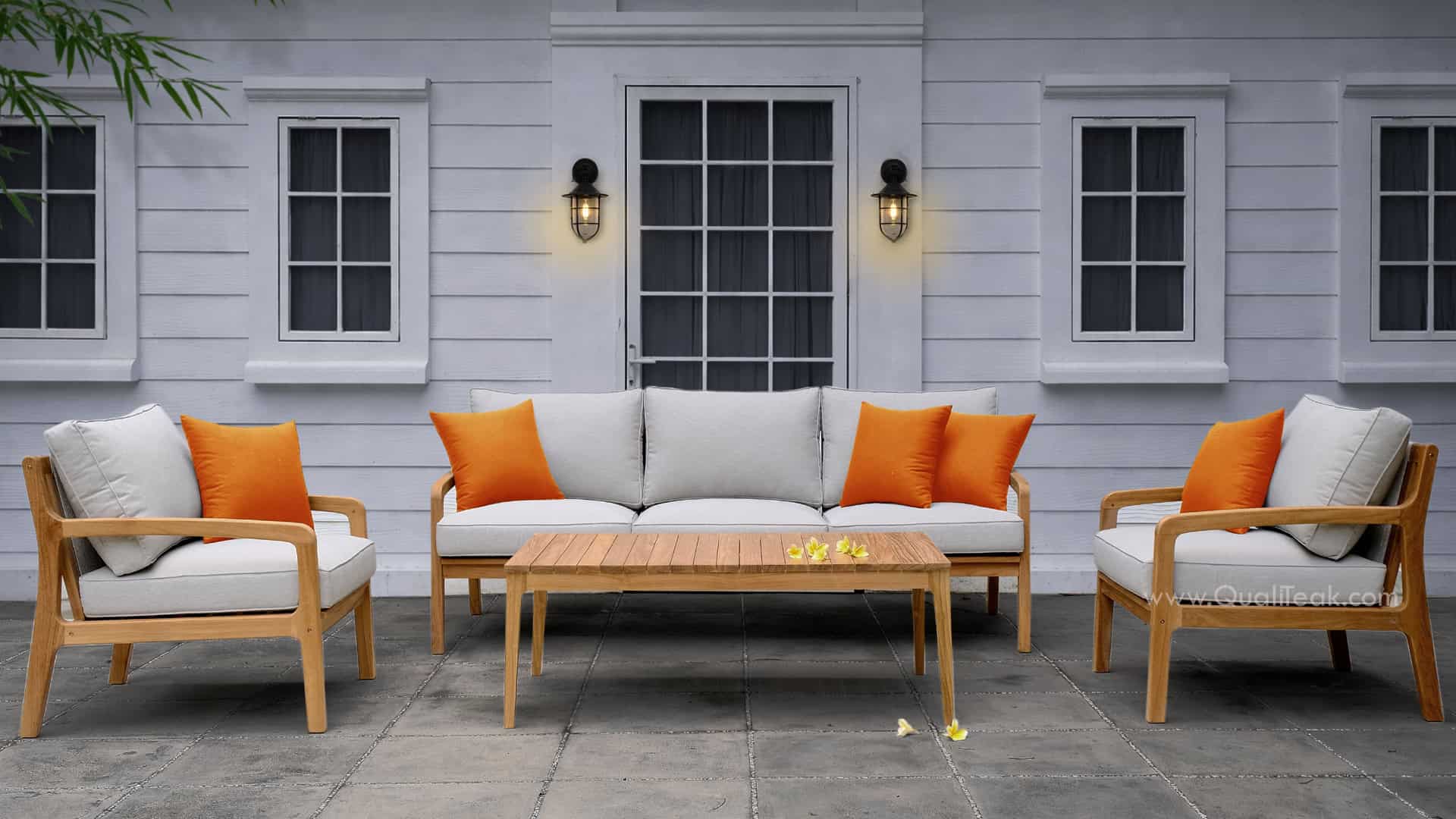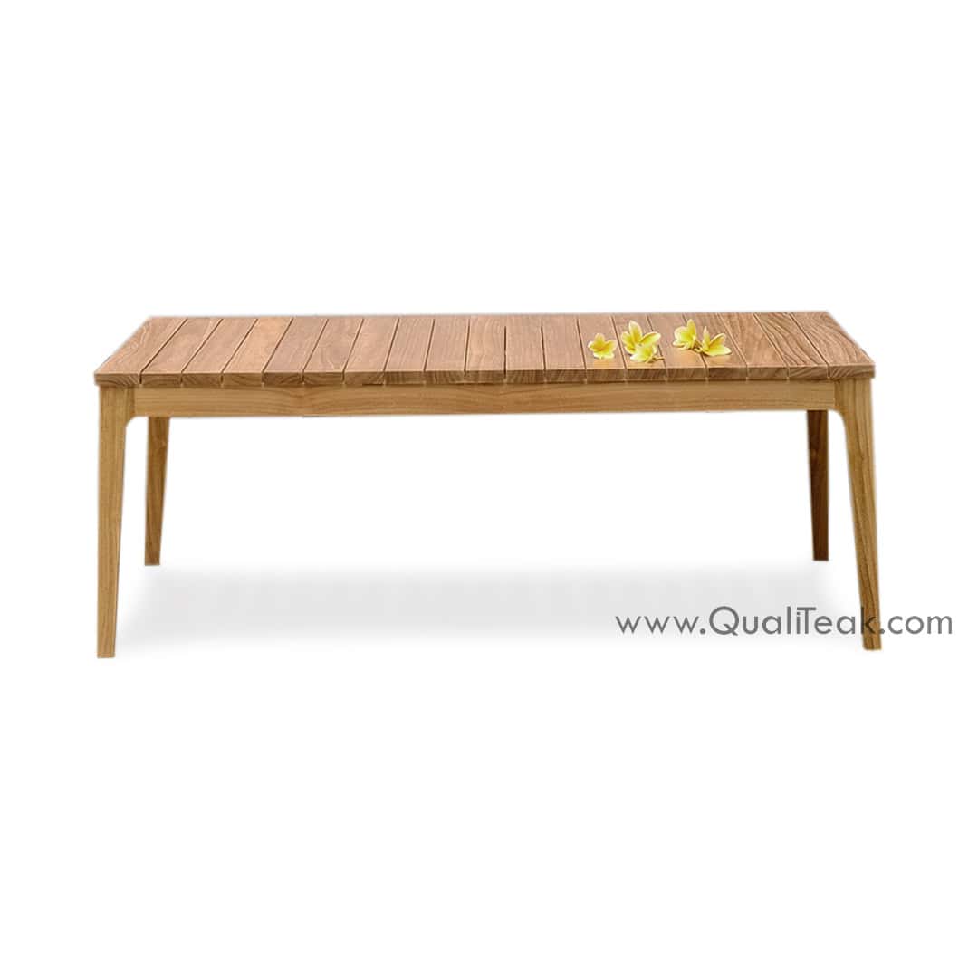 Quick-Drying Table: The accompanying solid teak coffee table features an architectural slatted top that allows rain to drain easily.