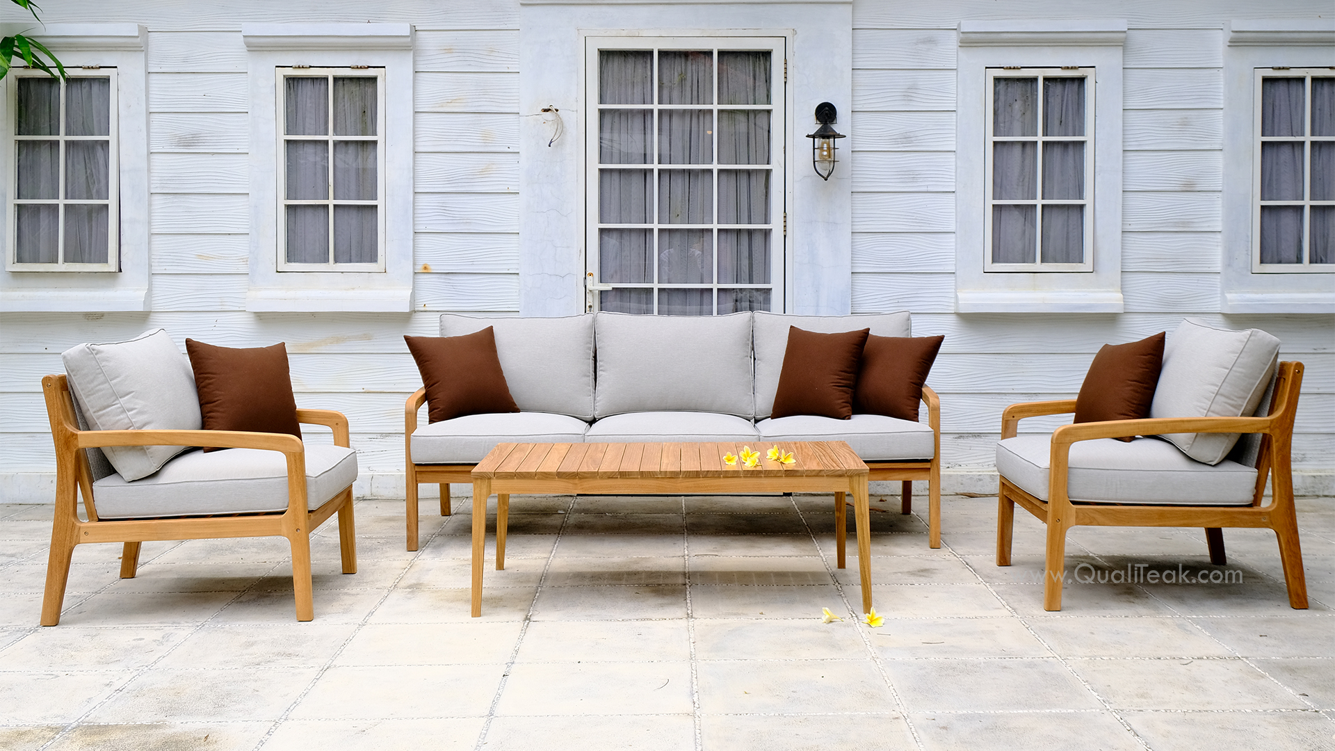 • Quick-Drying Table: The accompanying solid teak coffee table features an architectural slatted top that allows rain to drain easily.
