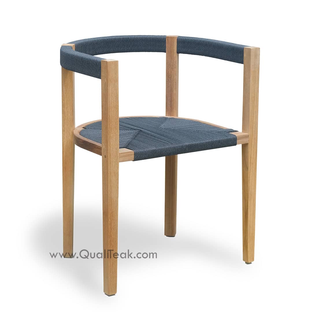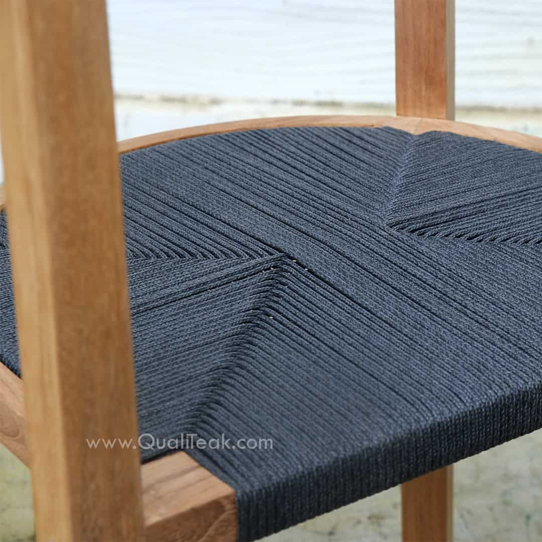 The Unison features a comfortable and visually appealing seat and backrest woven with durable black paracord rope. This design choice not only offers excellent support and breathability for relaxed outdoor dining but also creates a sophisticated contrast with the natural warmth of the teak.